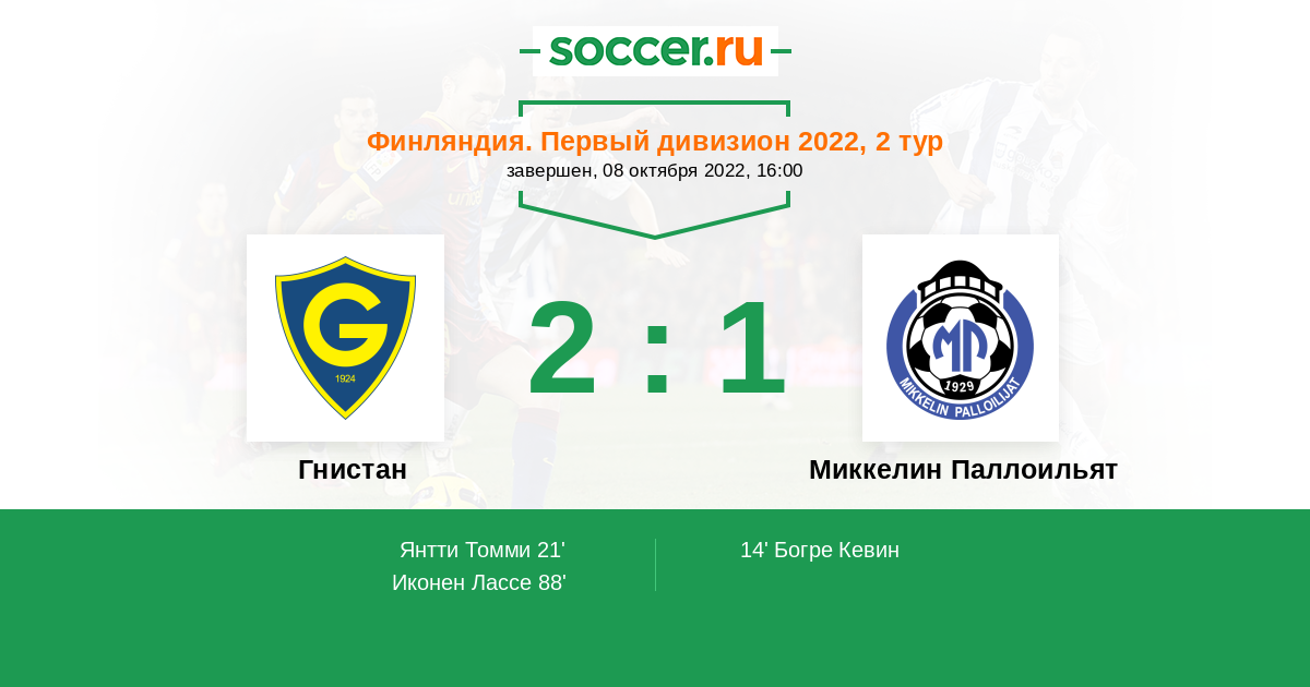 Финляндия. Первый дивизион 28.08.2022 Гнистан Логотип футбольный клуб Гнистан (Хельсинки) 0:2 Логотип футбольный клуб Миккелин Паллоильят Миккелин Паллоильят