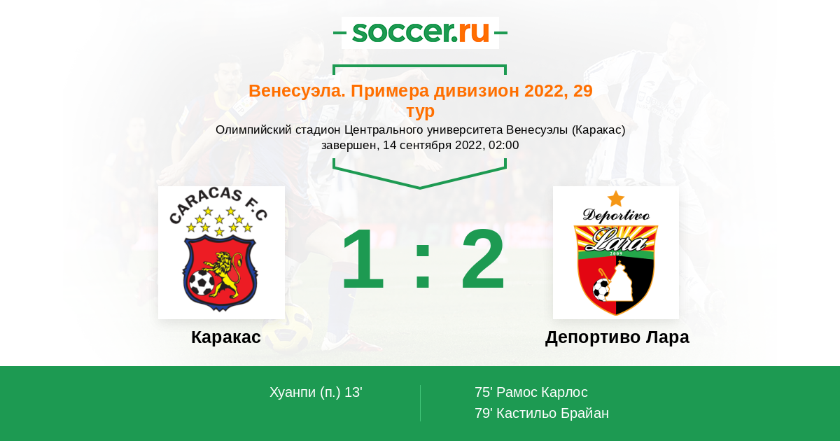 Венесуэла. Примера дивизион 23.09.2012 Депортиво Лара Логотип Депортиво Лара (Баркисимето) 1:2 Логотип футбольный клуб Каракас Каракас