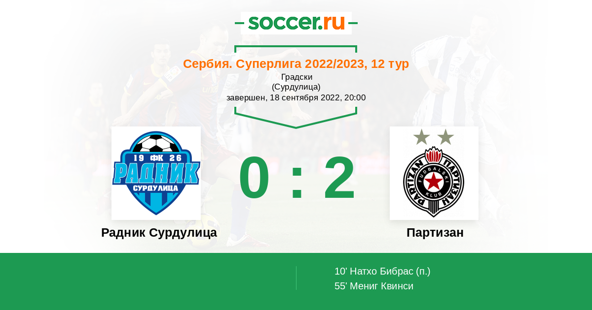 Сербия. Суперлига 21.03.2022 Радник Сурдулица Логотип футбольный клуб Радник Сурдулица 1:2 Логотип футбольный клуб Партизан (Белград) Партизан