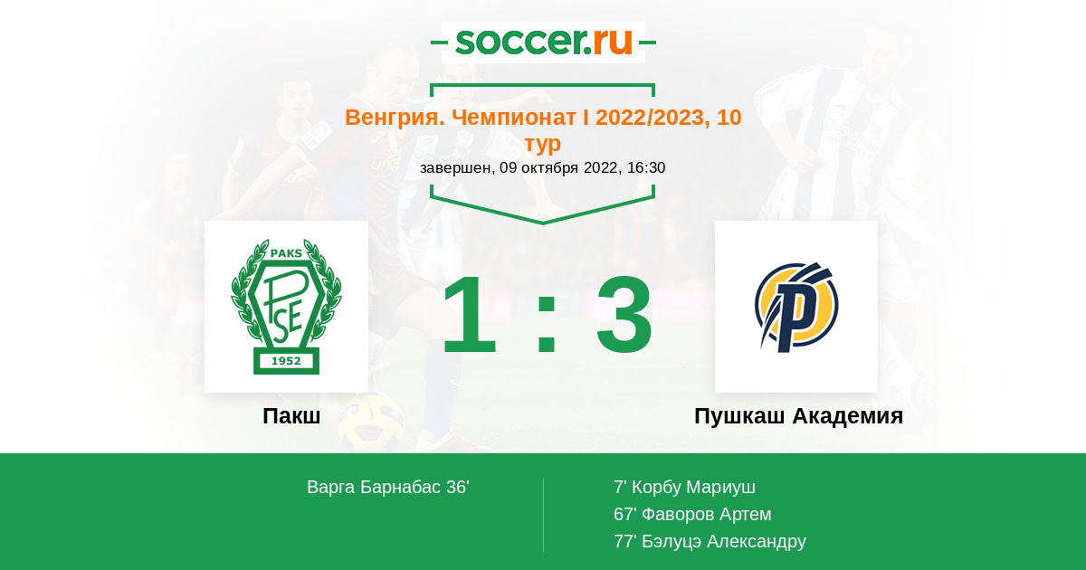 Венгрия. Чемпионат 1 30.09.2017 Пушкаш Академия Логотип футбольный клуб Пушкаш Академия (Фелксут) 1:2 Логотип футбольный клуб Пакш Пакш