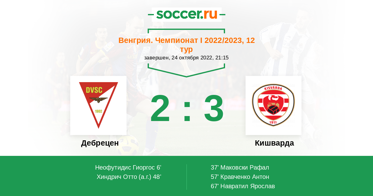Венгрия. Чемпионат 1 23.04.2022 Кишварда Логотип футбольный клуб Кишварда 1:0 Логотип футбольный клуб Дебрецен Дебрецен