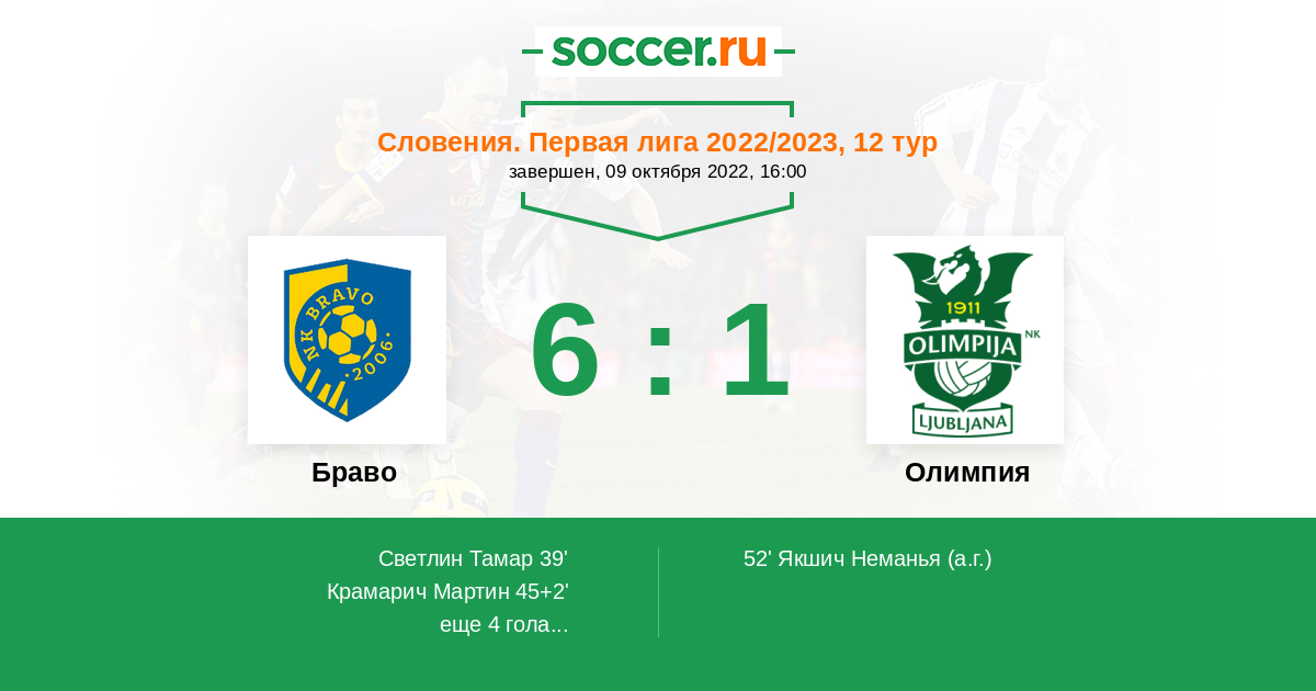 Словения. Первая Лига 22.09.2019 Олимпия Логотип футбольный клуб Олимпия (Любляна) 3:1 Логотип футбольный клуб Браво (Любляна) Браво