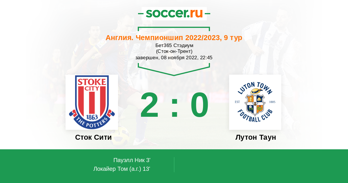 Англия. Чемпионшип 23.02.2022 Сток Сити Логотип футбольный клуб Сток Сити (Сток-он-Трент) 1:2 Логотип футбольный клуб Лутон Таун Лутон Таун
