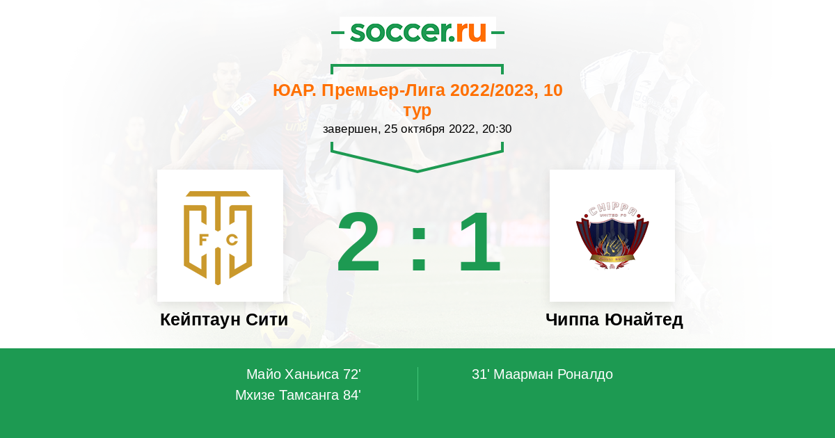 ЮАР. Премьер-Лига 03.11.2021 Кейптаун Сити Логотип футбольный клуб Кейптаун Сити 1:0 Логотип футбольный клуб Чиппа Юнайтед (Порт-Элизабет) Чиппа Юнайтед
