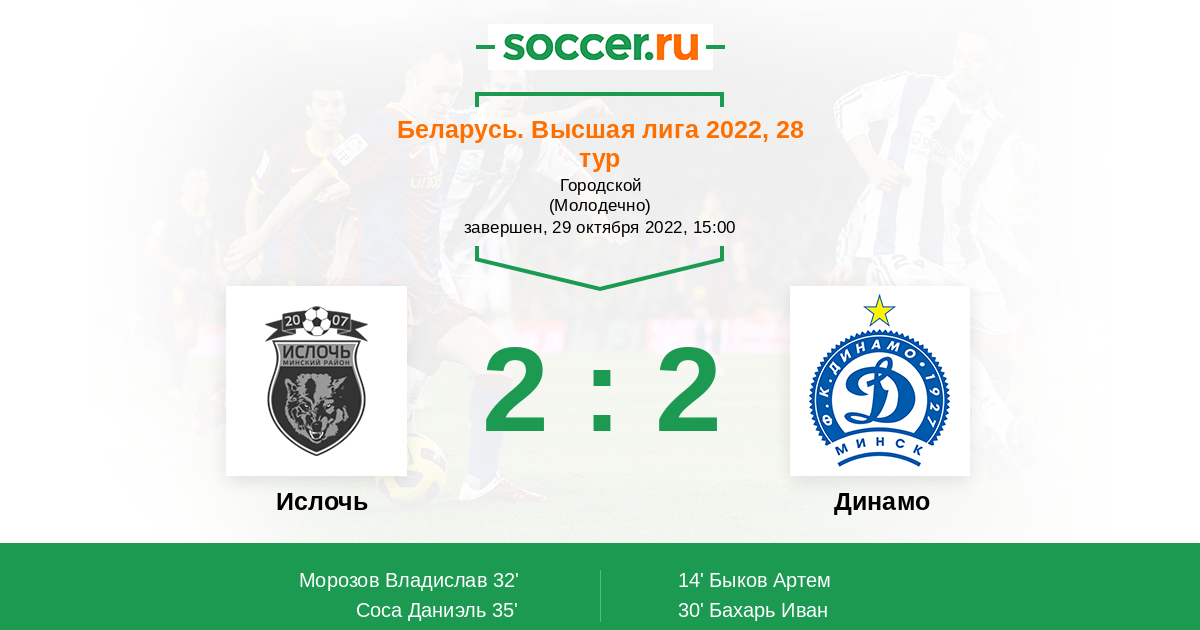 Беларусь. Высшая лига 02.07.2022 Динамо Логотип футбольный клуб Динамо (Минск) 1:2 Логотип футбольный клуб Ислочь (Минск) Ислочь