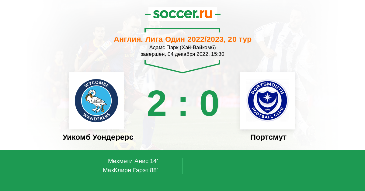 Англия. Первая Футбольная Лига 26.12.2019 Портсмут Логотип футбольный клуб Портсмут 2:0 Логотип футбольный клуб Уикомб Уондерерс (Хай-Вайкомб) Уикомб Уондерерс