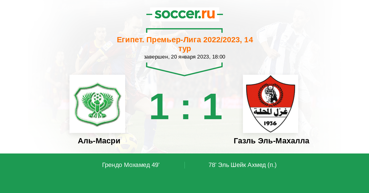 Египет. Премьер-Лига 28.10.2021 Газль Эль-Махалла Логотип футбольный клуб Газль Эль-Махалла 1:1 Логотип футбольный клуб Аль-Масри (Порт-Саид) Аль-Масри