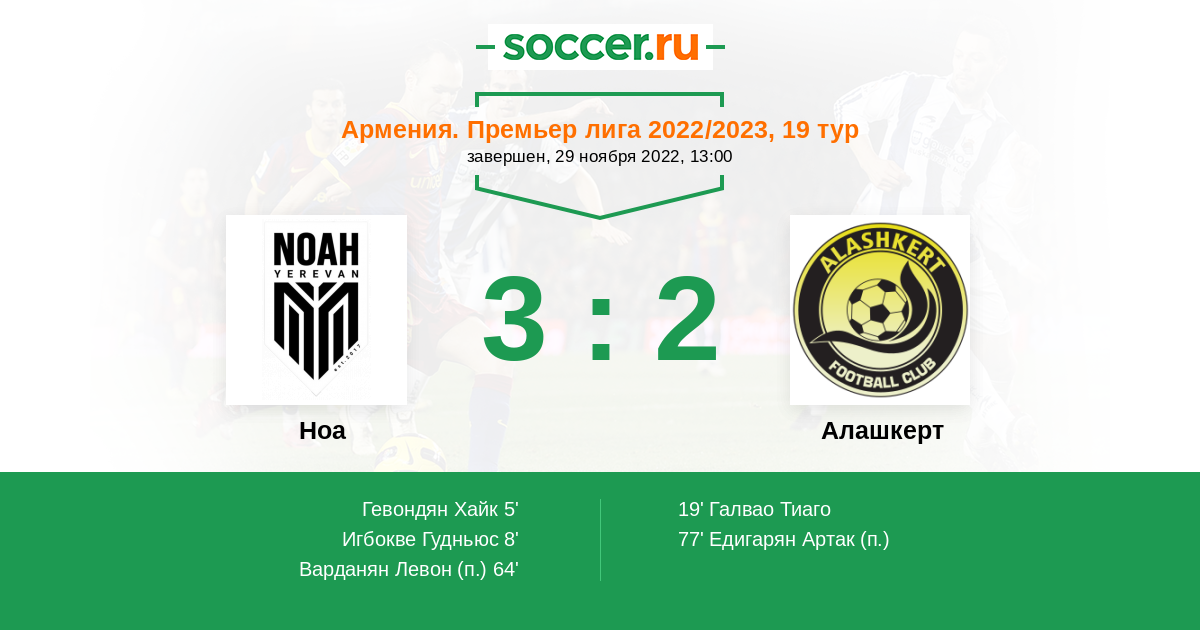 Армения. Премьер-лига 30.10.2023 Ноа Логотип футбольный клуб Ноа (Ереван) 4:2 Логотип футбольный клуб Алашкерт (Мартуни) Алашкерт