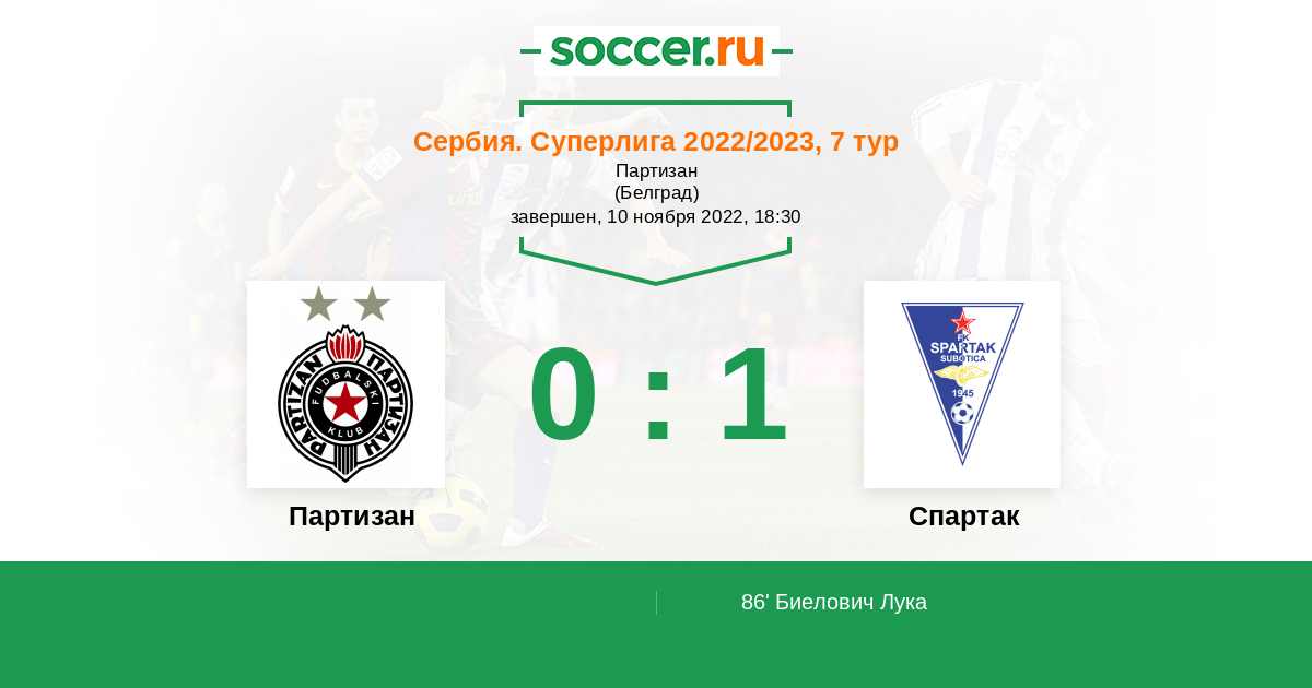 Сербия. Суперлига 26.09.2021 Партизан Логотип футбольный клуб Партизан (Белград) 5:0 Логотип футбольный клуб Спартак Суботица Спартак Суботица