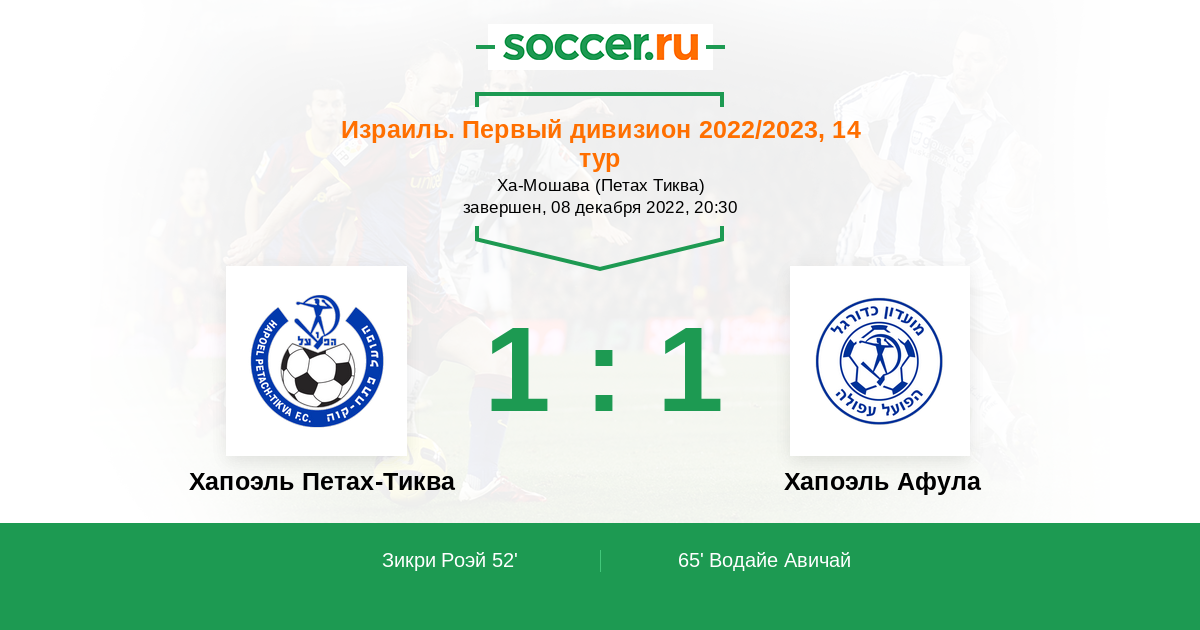 Израиль. Первый дивизион 23.12.2019 Хапоэль Петах-Тиква Логотип футбольный клуб Хапоэль Петах-Тиква 1:1 Логотип футбольный клуб Хапоэль Афула Хапоэль Афула