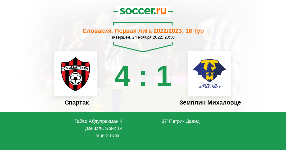 Словакия. Суперлига 02.11.2024 Спартак Логотип футбольный клуб Спартак (Трнава) 3:1 Логотип футбольный клуб Земплин Михаловце Земплин Михаловце