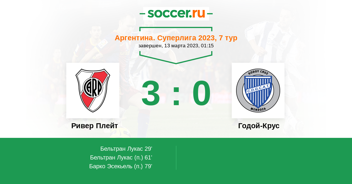 Аргентина. Суперлига 21.03.2021 Годой-Крус Логотип футбольный клуб Годой-Крус 1:6 Логотип футбольный клуб Ривер Плейт (Буэнос-Айрес) Ривер Плейт