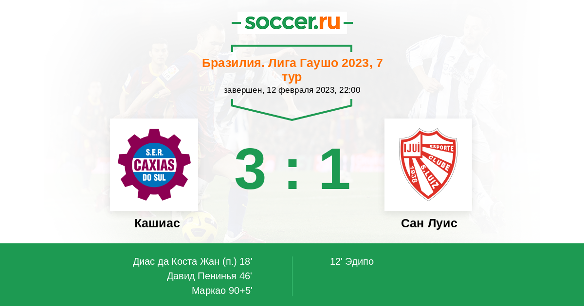 Бразилия. Лига Гаушо 17.02.2026 Сан Луис Логотип футбольный клуб Сан Луис 1:2 Логотип футбольный клуб Кашиас (Кашиас-ду-Сул) Кашиас