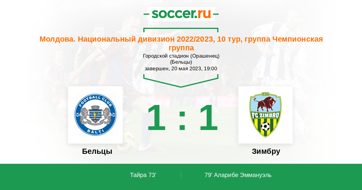 Молдова. Национальный дивизион 15.04.2023 Зимбру Логотип футбольный клуб Зимбру (Кишинев) 1:0 Логотип футбольный клуб Бельцы Бельцы