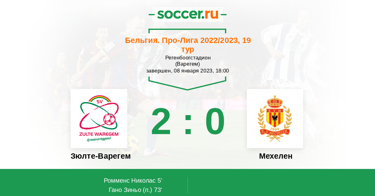 Бельгия. Про-Лига 05.11.2022 Мехелен Логотип футбольный клуб Мехелен 2:2 Логотип футбольный клуб Зюлте-Варегем Зюлте-Варегем