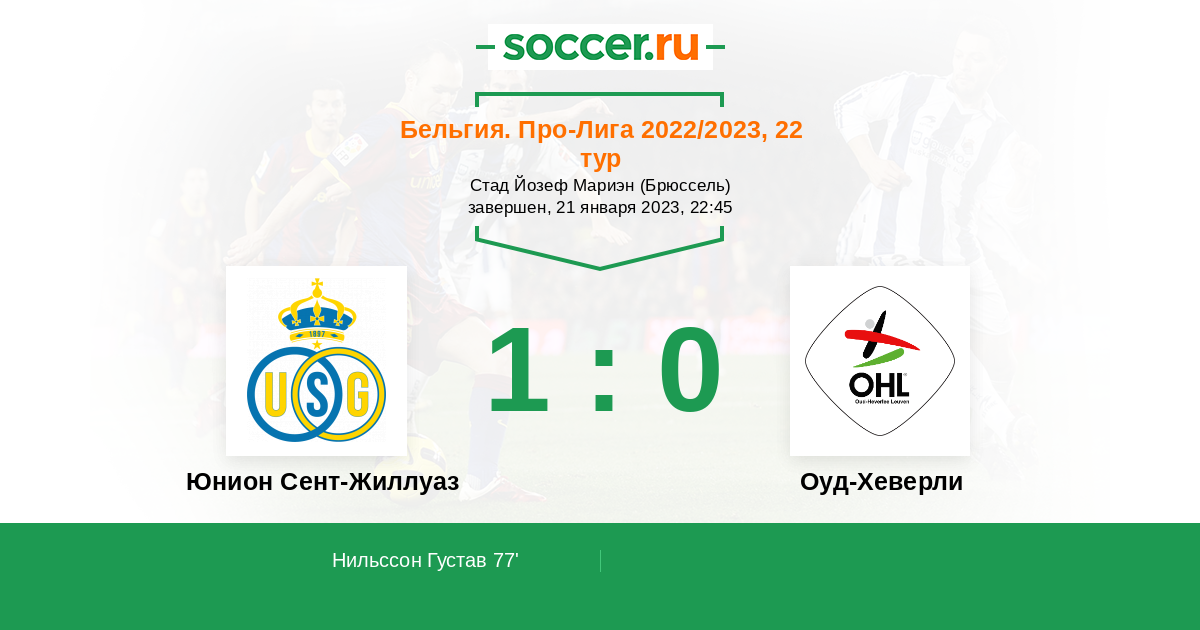 Бельгия. Про-Лига 01.10.2022 Оуд-Хеверли Логотип футбольный клуб Оуд-Хеверли (Левен) 0:3 Логотип футбольный клуб Юнион Сент-Жиллуаз (Брюссель) Юнион Сент-Жиллуаз
