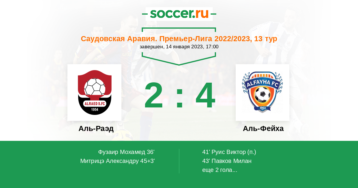 Саудовская Аравия. Премьер-Лига 14.09.2024 Аль-Фейха Логотип футбольный клуб Аль-Фейха (Аль-Маджмаа) 0:5 Логотип футбольный клуб Аль-Раэд (Бурайда) Аль-Раэд