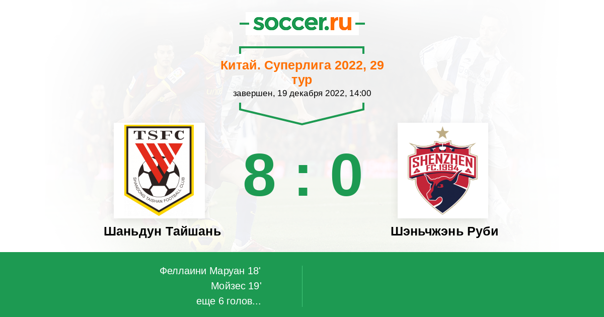 Китай. Суперлига 24.09.2022 Шэньчжэнь Руби Логотип футбольный клуб Шэньчжэнь Руби 0:4 Логотип футбольный клуб Шаньдун Тайшань (Цзинань) Шаньдун Тайшань