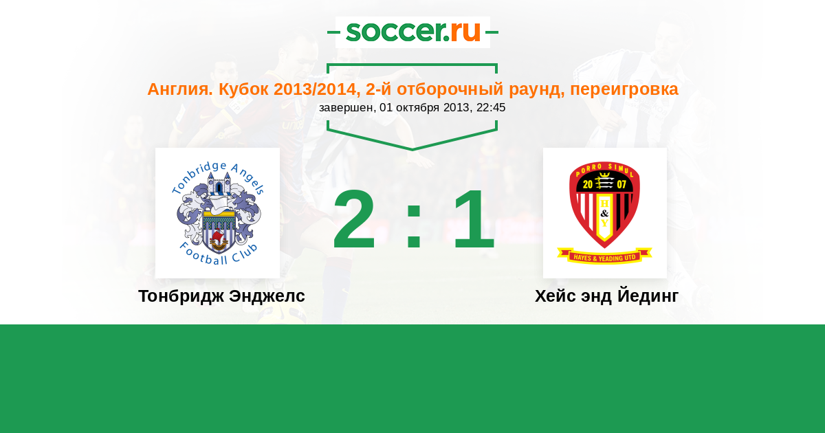 Англия. Кубок 01.10.2013 Тонбридж Энджелс Логотип футбольный клуб Тонбридж Энджелс 2:1 Логотип футбольный клуб Хейс энд Йединг Хейс энд Йединг