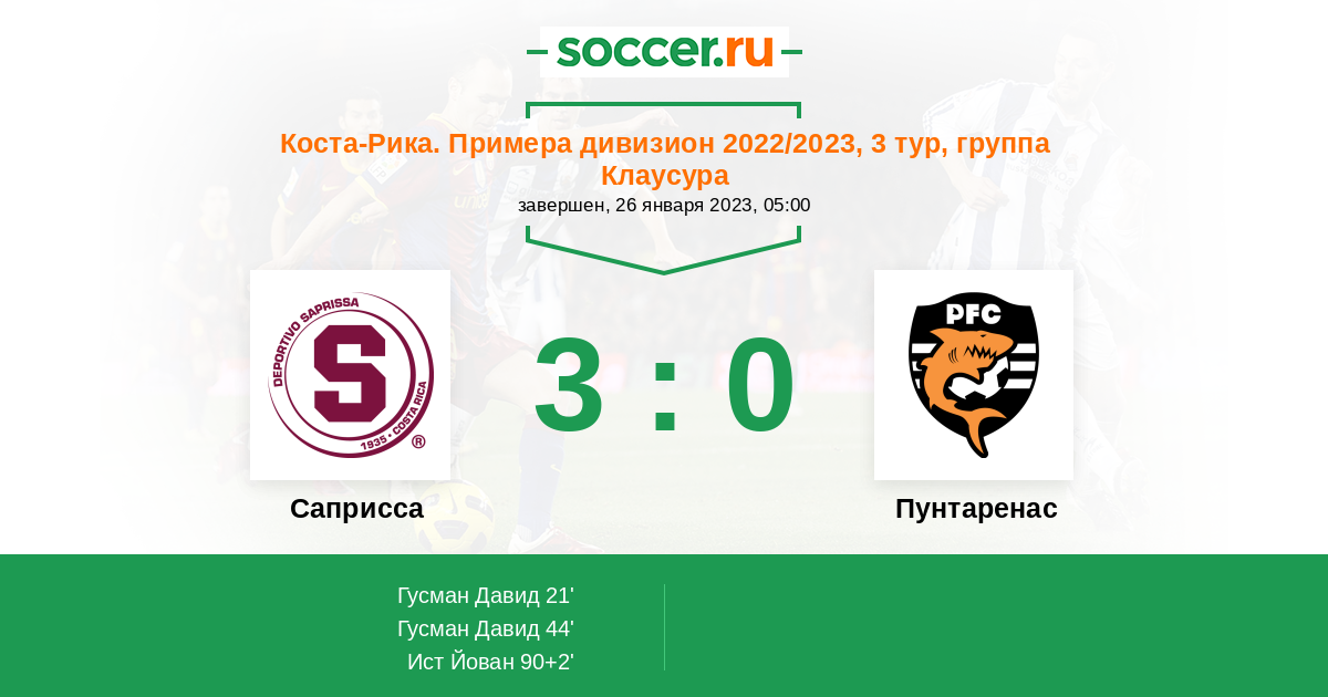 Коста-Рика. Примера дивизион 25.03.2023 Пунтаренас Логотип футбольный клуб Пунтаренас 3:2 Логотип футбольный клуб Саприсса (Сан Хосе) Саприсса