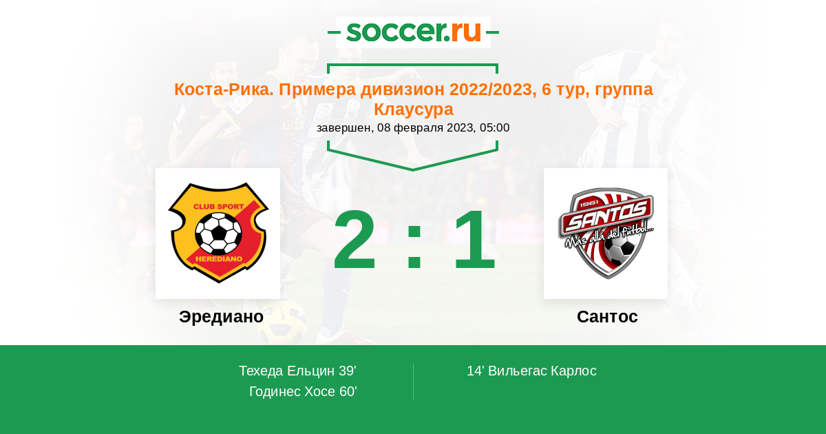 Коста-Рика. Примера дивизион 14.02.2021 Эредиано Логотип футбольный клуб Эредиано 2:1 Логотип футбольный клуб Сантос (Гуапилес) Сантос