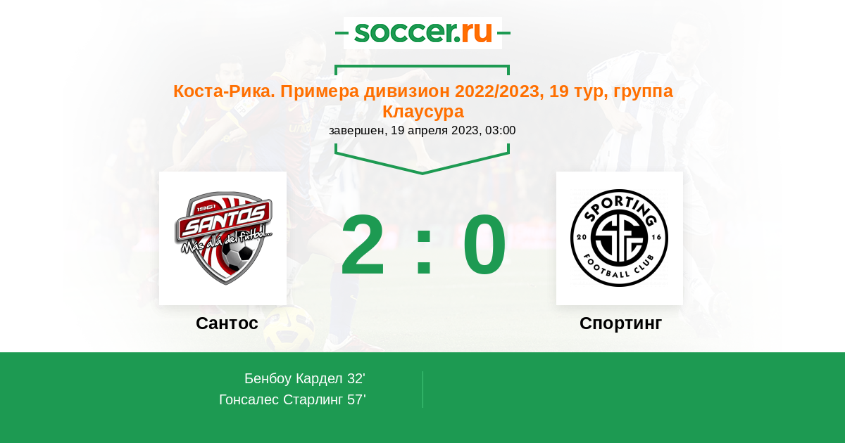 Коста-Рика. Примера дивизион 19.02.2023 Спортинг Сан-Хосе Логотип футбольный клуб Спортинг Сан-Хосе 1:1 Логотип футбольный клуб Сантос (Гуапилес) Сантос