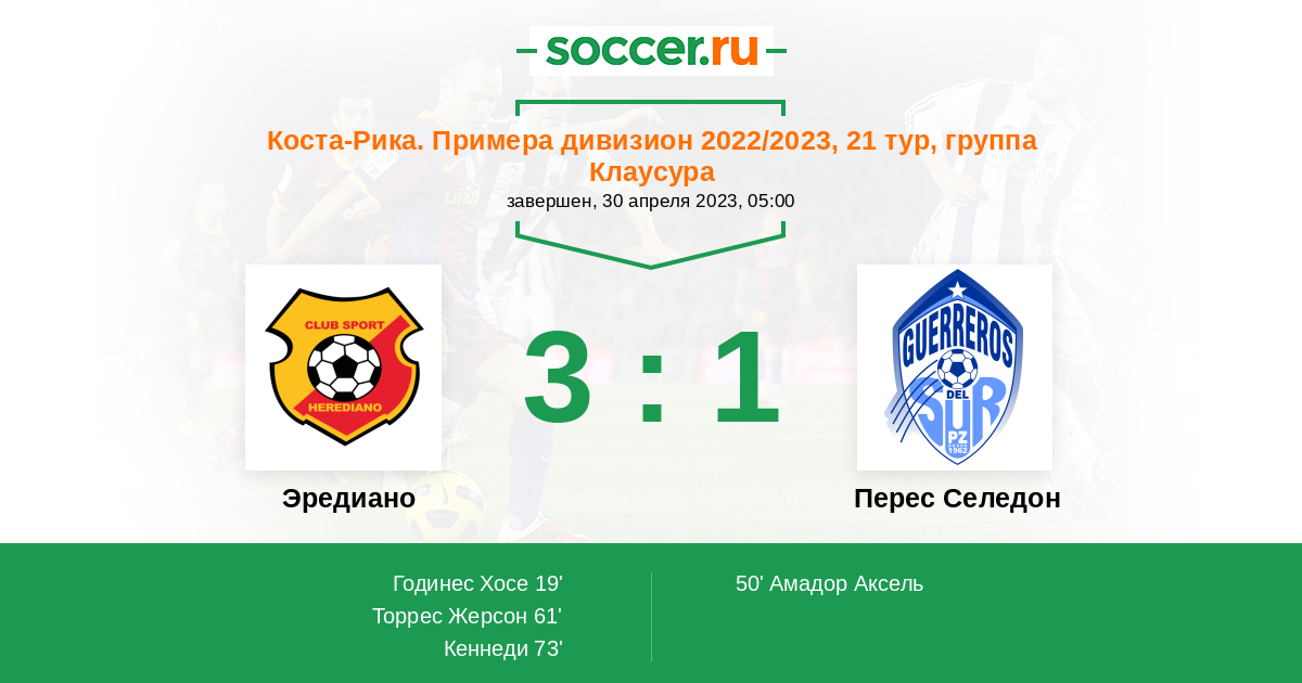 Коста-Рика. Примера дивизион 14.04.2013 Эредиано Логотип футбольный клуб Эредиано 5:1 Логотип футбольный клуб Зеледон (Сан Исидро де Эль Хенерал) Зеледон