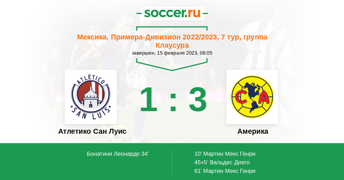 Мексика. Примера-Дивизион 06.02.2022 Америка Логотип футбольный клуб Америка (Мехико) 2:3 Логотип футбольный клуб Атлетико Сан Луис (Сан-Луис-Потоси) Атлетико Сан Луис