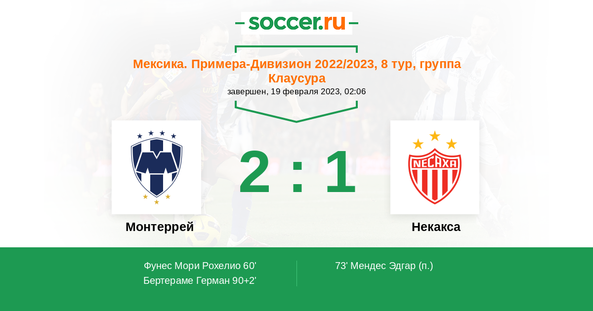 Мексика. Примера-Дивизион 15.01.2022 Некакса Логотип футбольный клуб Некакса (Агуаскальентес) 0:4 Логотип футбольный клуб Монтеррей Монтеррей