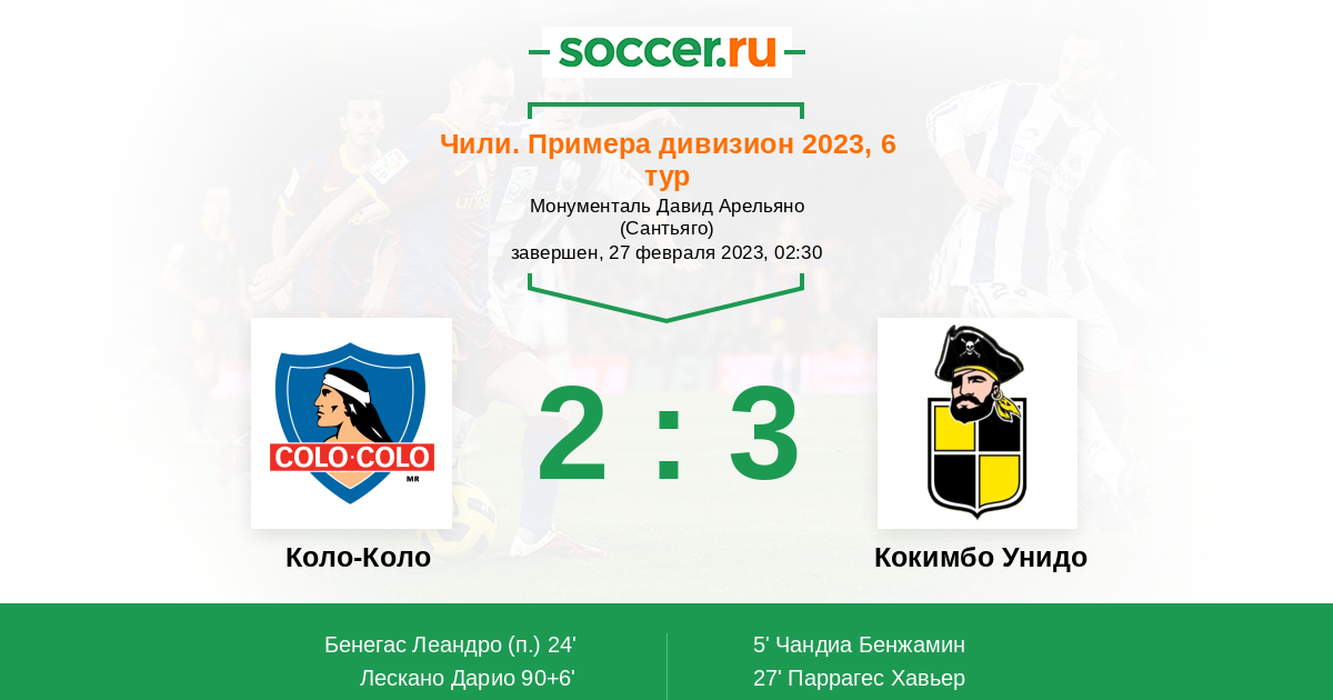 Чили. Примера дивизион 24.01.2021 Коло-Коло Логотип футбольный клуб Коло-Коло (Сантьяго) 2:1 Логотип футбольный клуб Кокимбо Унидо Кокимбо Унидо