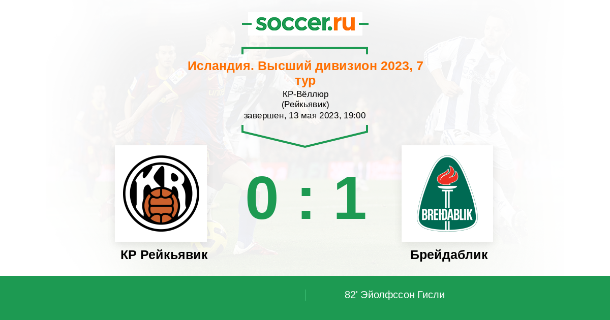Исландия. Высший дивизион 23.06.2022 Брейдаблик Логотип футбольный клуб Брейдаблик (Коупавогюр) 4:0 Логотип футбольный клуб КР Рейкьявик КР Рейкьявик