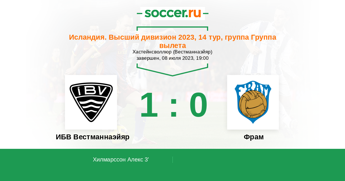 Исландия. Высший дивизион 23.06.2013 ИБВ Вестманнаэйяр Логотип футбольный клуб ИБВ Вестманнаэйяр 1:0 Логотип футбольный клуб Фрам (Рейкьявик) Фрам
