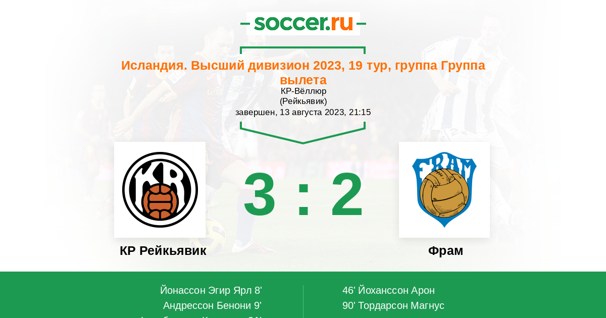 Исландия. Высший дивизион 22.05.2023 Фрам Логотип футбольный клуб Фрам (Рейкьявик) 1:2 Логотип футбольный клуб КР Рейкьявик КР Рейкьявик
