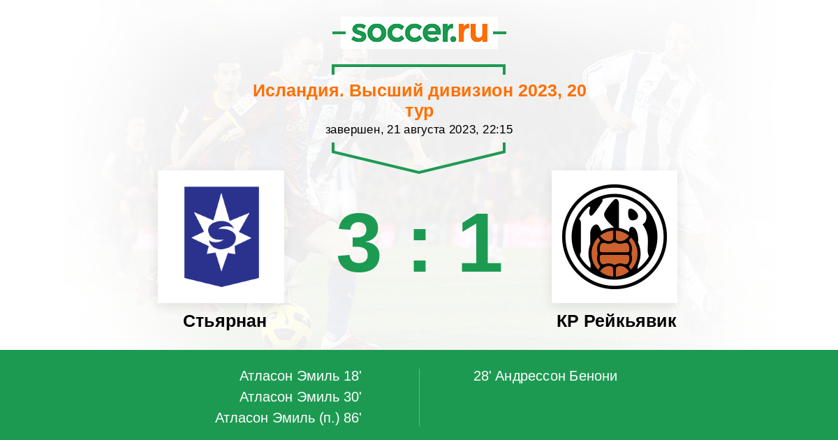 Исландия. Высший дивизион 31.08.2014 КР Рейкьявик Логотип футбольный клуб КР Рейкьявик 2:3 Логотип футбольный клуб Стьярнан (Гардабайр) Стьярнан