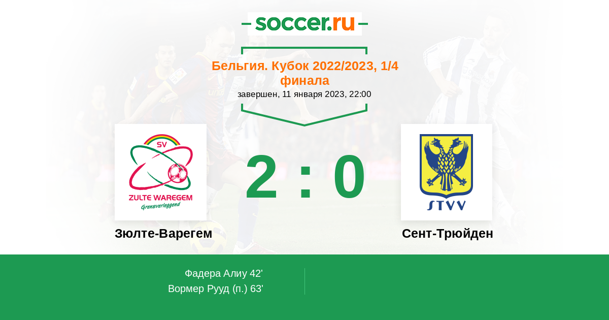 Бельгия. Про-Лига 12.03.2011 Зюлте-Варегем Логотип футбольный клуб Зюлте-Варегем 1:2 Логотип футбольный клуб Сент-Трюйден (Синт-Трёйден) Сент-Трюйден