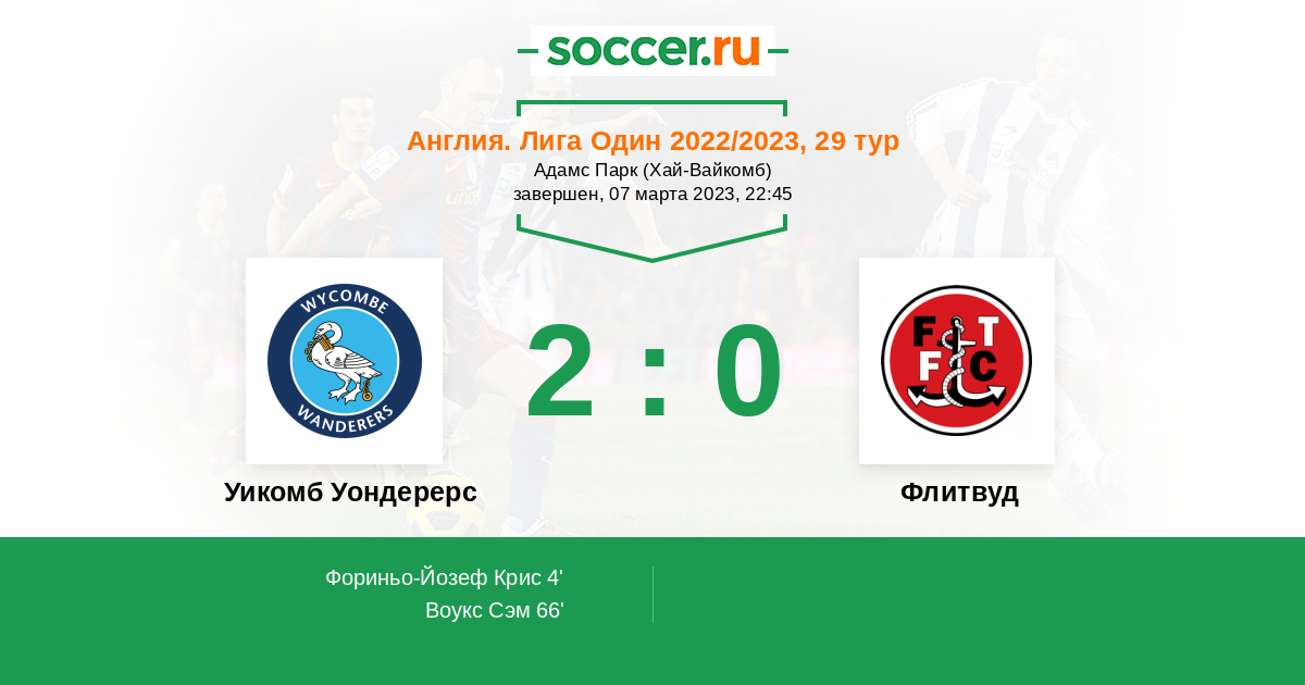 Англия. Первая Футбольная Лига 15.03.2022 Уикомб Уондерерс Логотип футбольный клуб Уикомб Уондерерс (Хай-Вайкомб) 1:0 Логотип футбольный клуб Флитвуд Флитвуд