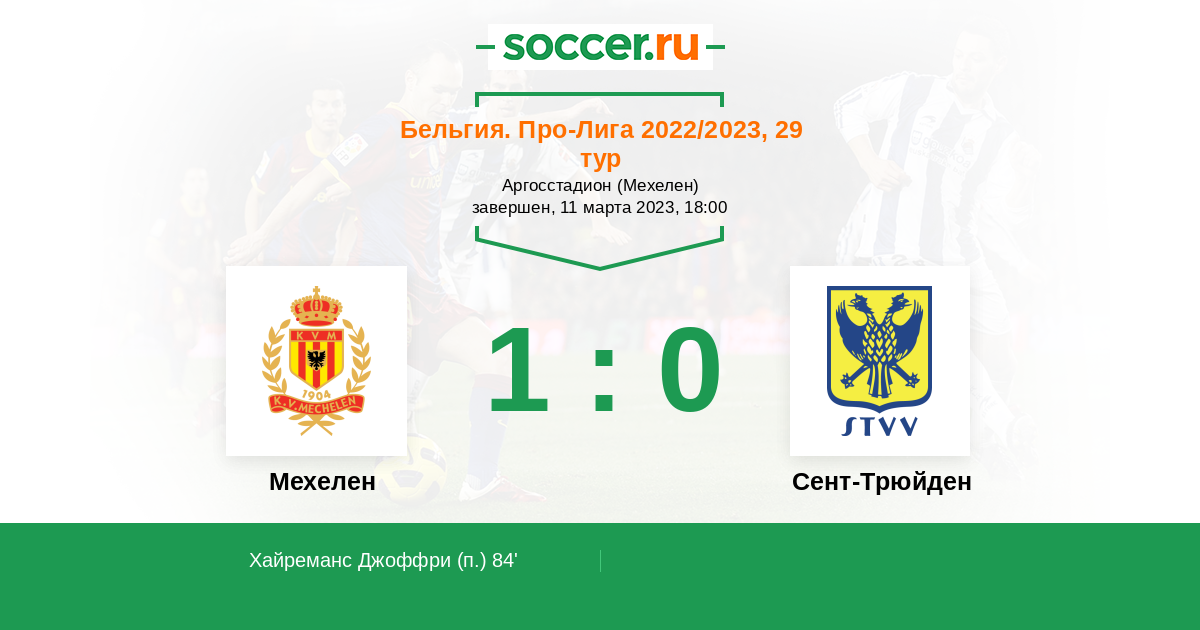 Бельгия. Про-Лига 06.11.2021 Мехелен Логотип футбольный клуб Мехелен 0:1 Логотип футбольный клуб Сент-Трюйден (Синт-Трёйден) Сент-Трюйден