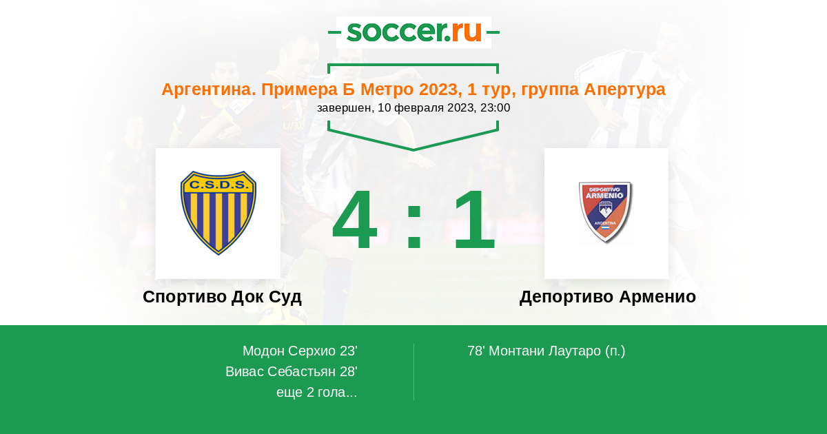 Аргентина. Примера Б Метро 10.11.2024 Спортиво Док Суд Логотип футбольный клуб Спортиво Док Суд (Буэнос-Айрес) 0:2 Логотип футбольный клуб Депортиво Арменио Депортиво Арменио