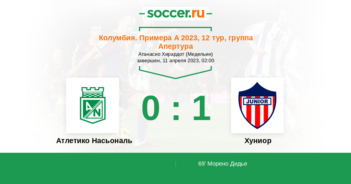 Колумбия. Примера А 26.04.2018 Хуниор Логотип футбольный клуб Хуниор (Барранкилья) 1:1 Логотип футбольный клуб Атлетико Насьональ (Медельин) Атлетико Насьональ