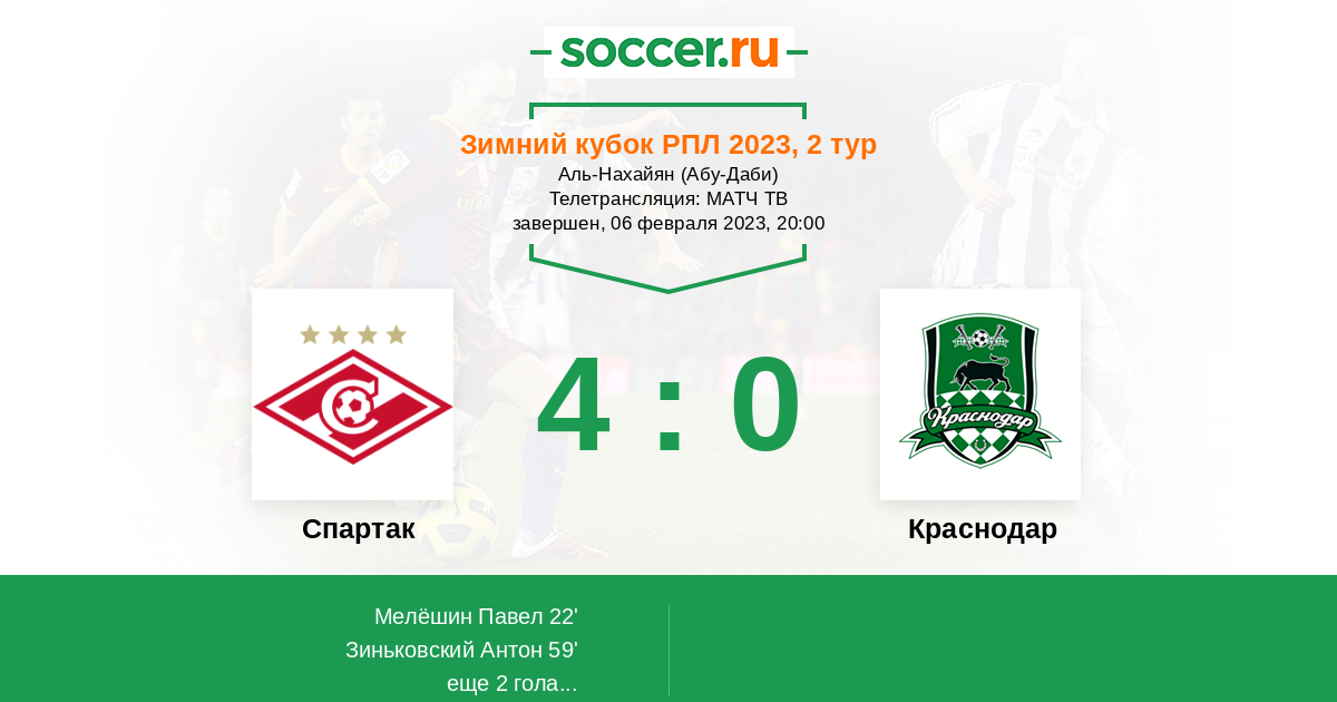 Зимний кубок РПЛ 30.01.2025 Спартак Логотип футбольный клуб Спартак (Москва) 3:2 Логотип футбольный клуб Краснодар Краснодар