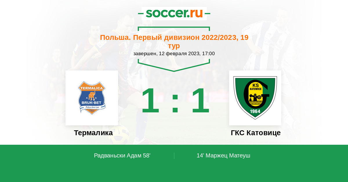 Польша. Первый дивизион 20.04.2019 Термалика Логотип футбольный клуб Термалика (Нецеча) 1:1 Логотип футбольный клуб ГКС Катовице ГКС Катовице