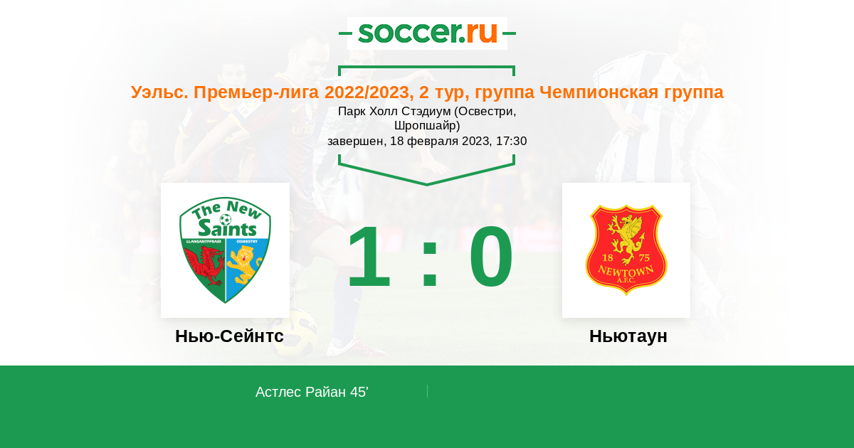 Уэльс. Премьер-Лига 01.04.2023 Ньютаун Логотип футбольный клуб Ньютаун 0:5 Логотип футбольный клуб Нью-Сейнтс (Ллансантффрайд) Нью-Сейнтс