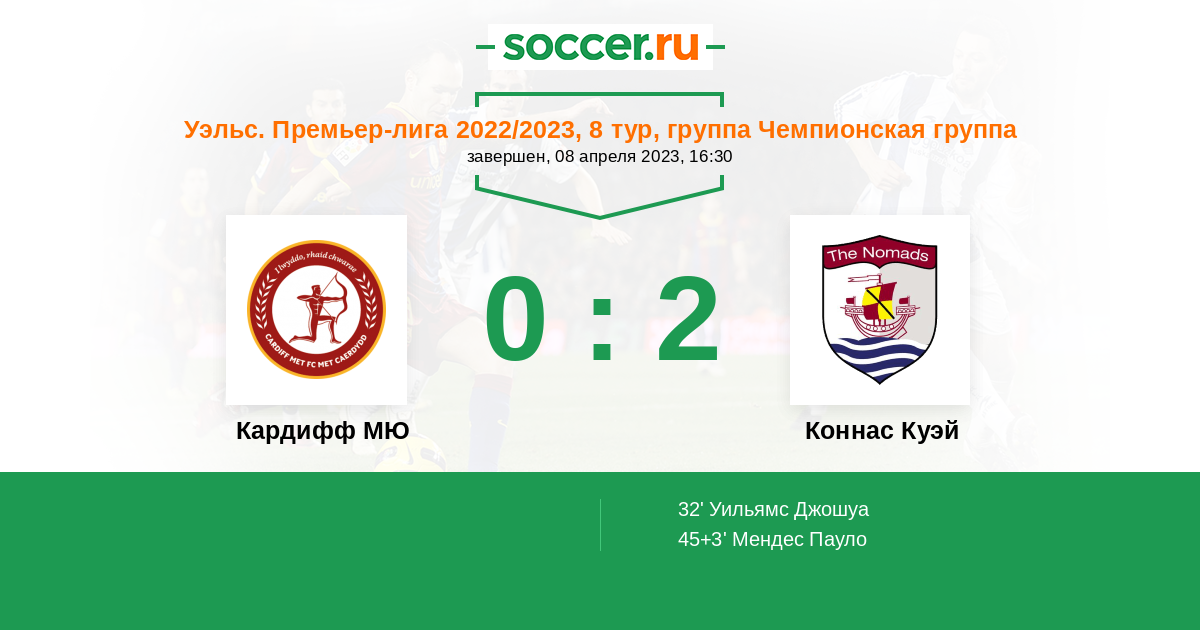 Уэльс. Премьер-Лига 04.11.2023 Кардифф МЮ Логотип футбольный клуб Кардифф МЮ 3:1 Логотип футбольный клуб Коннас Куэй Коннас Куэй