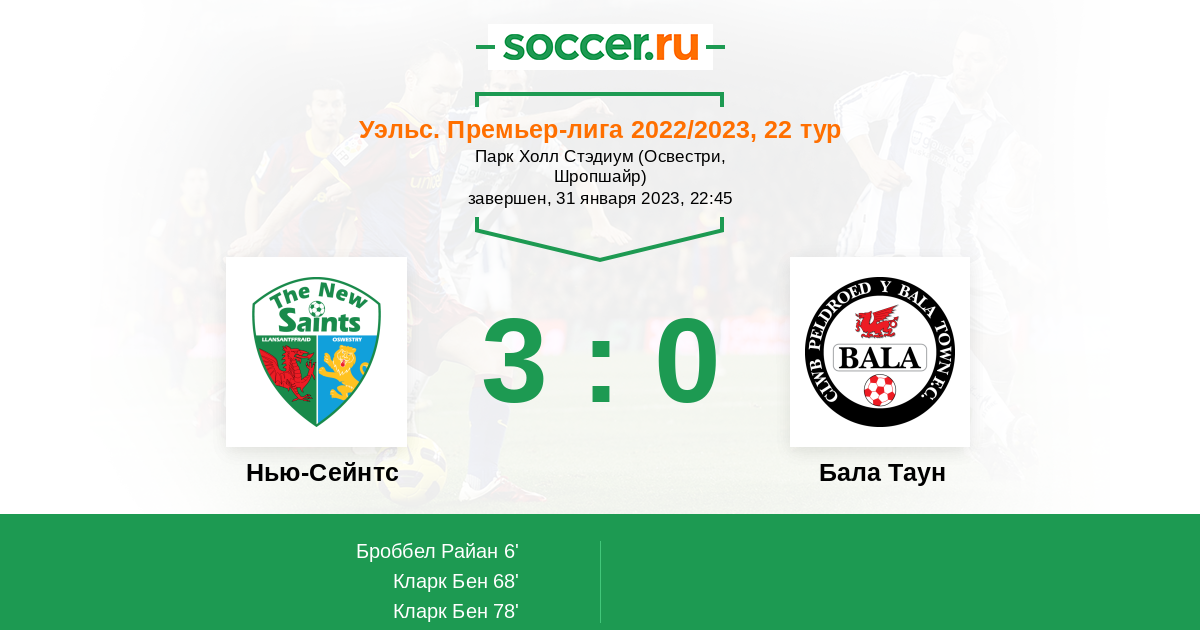Уэльс. Премьер-Лига 13.03.2023 Нью-Сейнтс Логотип футбольный клуб Нью-Сейнтс (Ллансантффрайд) 2:1 Логотип футбольный клуб Бала Таун Бала Таун