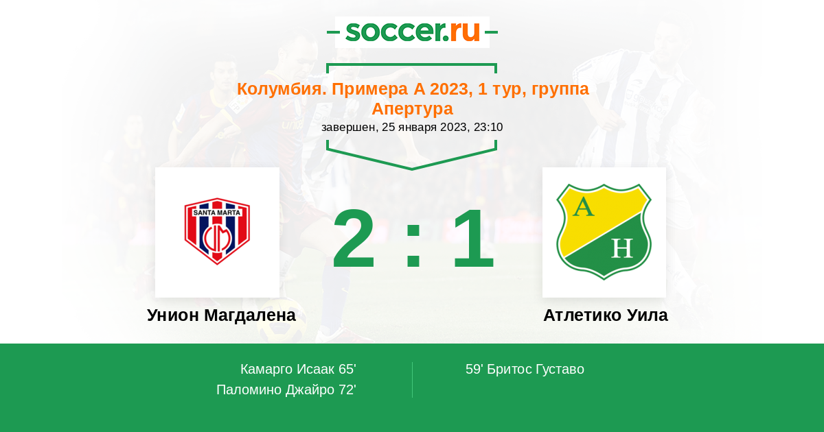 Колумбия. Примера А 15.07.2023 Атлетико Уила Логотип футбольный клуб Атлетико Уила (Нейва) 2:1 Логотип футбольный клуб Унион Магдалена (Санта Марта) Унион Магдалена