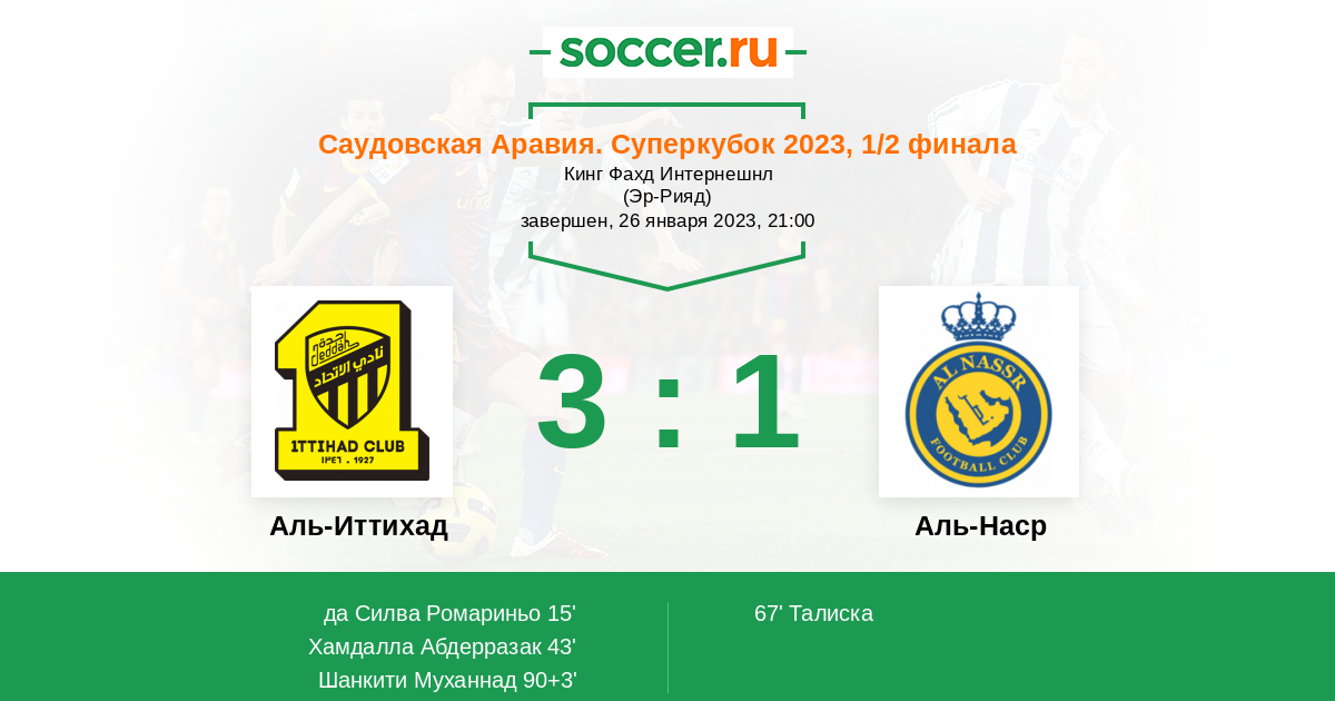 Саудовская Аравия. Премьер-Лига 26.12.2023 Аль-Иттихад Логотип футбольный клуб Аль-Иттихад (Джидда) 2:5 Логотип футбольный клуб Аль-Наср (Эр-Рияд) Аль-Наср