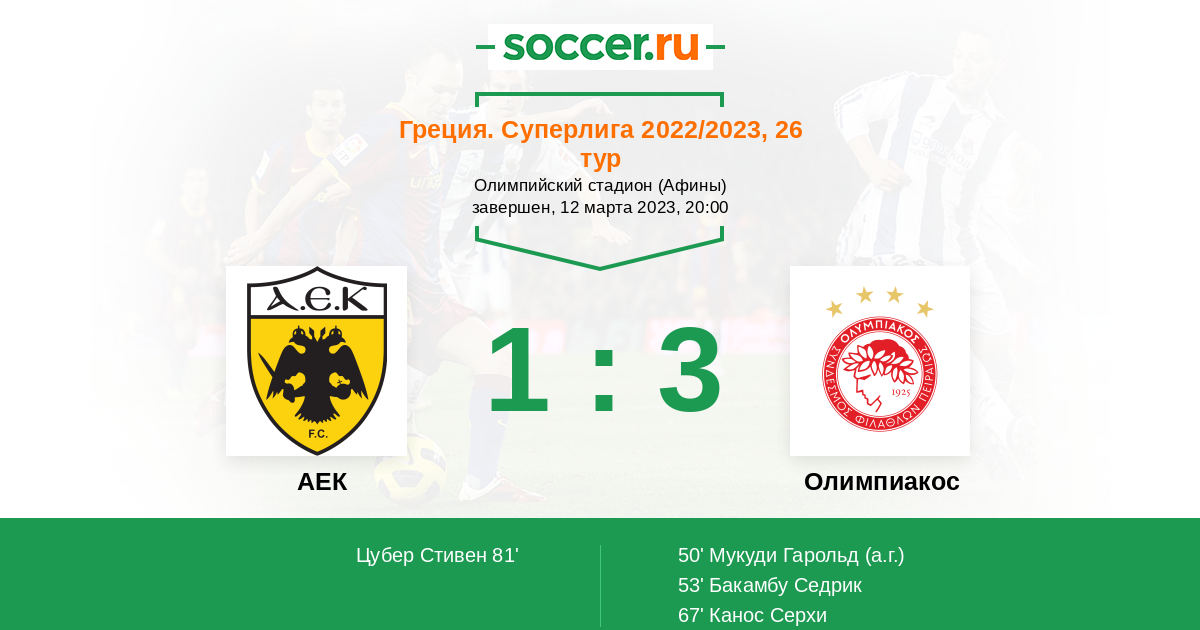 Греция. Суперлига 23.04.2023 Олимпиакос Логотип футбольный клуб Олимпиакос (Пирей) 1:3 Логотип футбольный клуб АЕК (Афины) АЕК