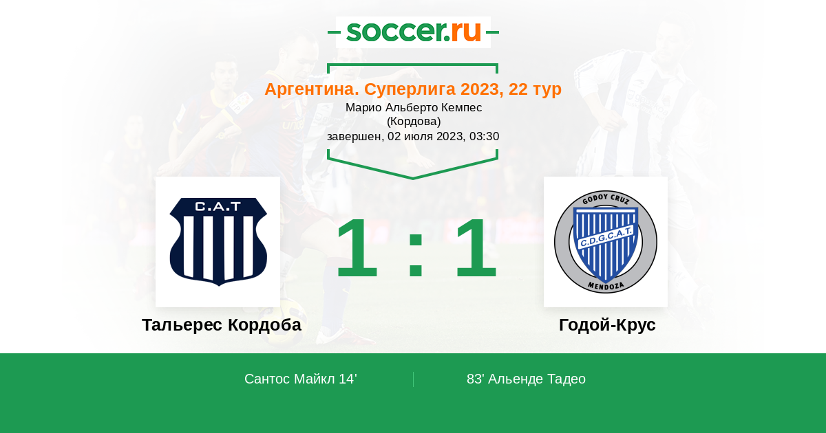 Аргентина. Суперлига 09.10.2022 Тальерес Кордоба Логотип футбольный клуб Тальерес Кордоба 3:1 Логотип футбольный клуб Годой-Крус Годой-Крус