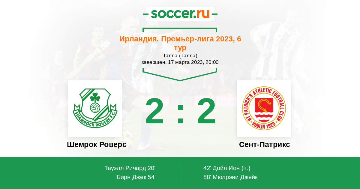 Ирландия. Премьер-лига 21.04.2023 Сент-Патрикс Логотип футбольный клуб Сент-Патрикс (Дублин) 0:2 Логотип футбольный клуб Шемрок Роверс (Дублин) Шемрок Роверс