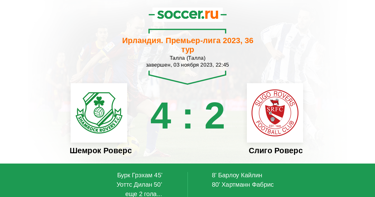 Ирландия. Премьер-лига 01.11.2025 Шемрок Роверс Логотип футбольный клуб Шемрок Роверс (Дублин) 1:2 Логотип футбольный клуб Слиго Роверс Слиго Роверс